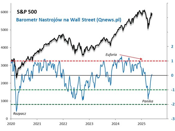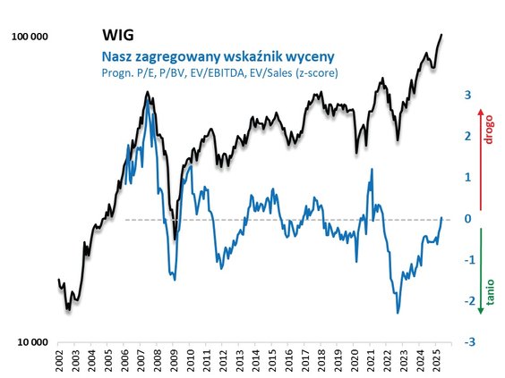 Maj był pierwszym w historii miesiącem, który WIG zakończył powyżej okrągłego poziomu 100 tys. pkt. Jest co świętować, ale trzeba też mieć świadomość, że obecna hossa na GPW jest już dość zaawansowana. Po 32 miesiącach od startu jest to rynek byka najdłuższy od... 2007 roku (wszystkie poprzednie cztery hossy były krótsze – trwały 19–27 miesięcy). Bazując na danych miesięcznych, WIG kończył maj 121 proc. powyżej dołka z września 2022 roku. Ową siłę i relatywnie długi czas trwania rynku byka tłumaczyć można zapewne niezwykle nisko położonym punktem wyjścia. Obliczany przez nas zagregowany wskaźnik wyceny polskich akcji (uwzględniający cztery popularne miary: prognozowane P/E, P/BV, EV/EBITDA i EV/Sales) na jesieni 2022 roku był rekordowo nisko i sygnalizował ekstremalne niedowartościowanie. Od tego czasu przebył długą drogę – maj po raz pierwszy od 2021 roku zakończył tuż powyżej poziomu neutralnego.