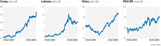 Tylko od początku 2025 roku do grona najbardziej wartościowych giełdowych firm, wycenianych przez rynek powyżej 1 mld zł i liczącego już 82 spółki, dołączyło dziewięć kolejnych. Ich przyrost jest jeszcze bardziej zauważalny, jeśli weźmiemy pod uwagę okres ostatnich dziesięciu lat. Na koniec I półrocza 2015 r. na krajowym rynku mieliśmy 69 spółek z wyceną powyżej 1 mld zł. Jeśli jednak pominiemy kilkanaście firm, które w międzyczasie zostały z różnych powodów zdjęte z giełdy i próżno ich szukać w porównywalnym zestawieniu za 2025 rok, jak np. Lotos, Energa, PGNiG, Synthos Comarch czy Ciech (choć warto zauważyć, że z nich część została wchłonięta przez inne, obecnie notowane podmioty), to ich liczba kurczy się do zaledwie 53, czyli o blisko 30 mniej niż obecnie. Dwie najbardziej wartościowe spółki z krajowego parkietu – Orlen i PKO BP – przebiły w tym roku po raz pierwszy w swojej giełdowej historii barierę 100 mld zł. Wcześniej tylko Allegro dało radę przebić ten poziom, które aktualnie jest wyceniane dużo niżej. Z kolei liczba spółek wycenionych powyżej poziomu od początku tego roku zwiększyła się z 22 do 24.