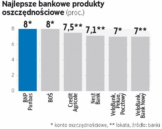 Najwyżej oprocentowane konta oszczędnościowe są obecnie dwa: w Banku BNP Paribas BP i BOŚ, po 8 proc. Konto Pełne Marzeń tego pierwszego ma wysokie oprocentowanie tylko do 10 tys. zł. Oferta skierowana jest zarówno do nowych, jak i obecnych klientów – oczywiście posiadających konto osobiste. Oferta obowiązuje do 30 września – i tylko do końca miesiąca naliczane będzie wyższe oprocentowanie. Standardowe to 1 proc.