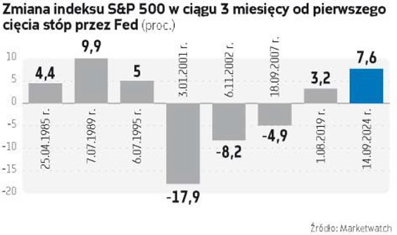 Dane historyczne wskazują, że nowojorski indeks giełdowy S&P 500 zwykle wypracowywał dodatnią stopę zwrotu w okresie trzech i dwunastu miesięcy od pierwszej obniżki stóp procentowych w danym cyklu lub od wznowienia obniżek przez Fed. W okresie ostatnich 45 lat do największych zwyżek doszło po cięciu stóp z października 1982 r. Wówczas S&P 500 zyskał 15,1 proc. od tej obniżki, a w ciągu 12 miesięcy wzrósł aż o 36,2 proc. Od 1980 r. Fed dziesięciokrotnie zaczynał (lub wznawiał po dłuższej przerwie) cykle luzowania polityki pieniężnej. W czterech spośród tych przypadków, S&P 500 tracił w ciągu trzech miesięcy od cięcia stóp. Tylko dwukrotnie zniżkował on w trakcie 12 miesięcy od rozpoczęcia obniżek. Było tak w 2001 r., po pęknięciu bańki internetowej oraz w 2007 r., po wybuchu kryzysu subprime. Najgorzej się zachowywał w ciągu roku od tego drugiego cięcia. Stracił wówczas 23,9 proc. Średnio, w okresie ostatnich 45 lat, S&P 500 zyskiwał 1,4 proc. w ciągu trzech miesięcy od pierwszego cięcia stóp, a w ciągu 12 miesięcy rósł o 11 proc. Po wyłączeniu jednak cięć z czasów dwóch poważnych kryzysów rynkowych, S&P 500 rósł średnio o odpowiednio: 4,6 proc. i 18,4 proc.