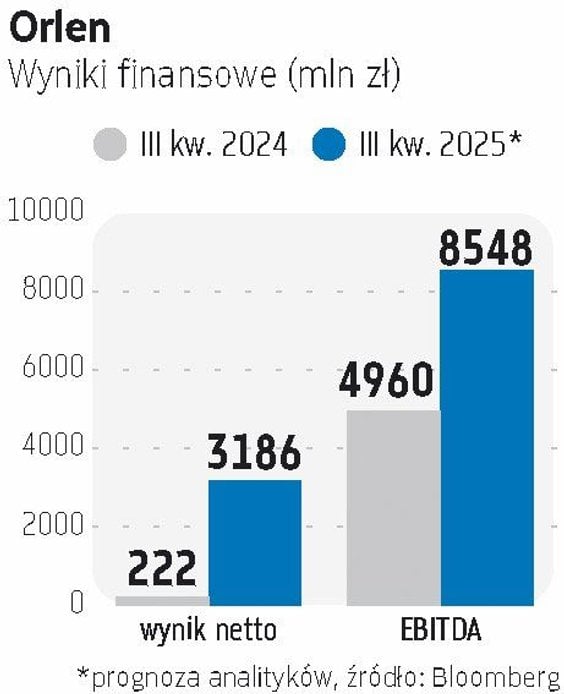 Tak było w przypadku Orlenu, którego notowania od dłuższego czasu dynamicznie rosną. Wsparciem było m. in. korzystne otoczenie w postaci wysokich marż rafineryjnych. – Uważamy, że niedawny wzrost kursu akcji Orlenu był w dużej mierze napędzany oczekiwaniami na silne wyniki za III kw. 2025 r., zwłaszcza że rynek obserwował korzystną ewolucję wskaźnika marży rafineryjnej w dość wysokim przedziale w każdym miesiącu. W związku z tym nie wykluczamy, że rynek już wycenia całkiem dobry wynik kwartalny. Przewidujemy, że skorygowana EBITDA LIFO za III kwartał 2025 r. bez odpisów aktualizujących może wynieść około 9 mld zł, co niekoniecznie może pobudzić kolejną falę optymizmu, naszym zdaniem – szacują analitycy Ipopemy. Ich zdaniem sezonowo słabsze wyniki w segmencie energetycznym zostaną w pewnym stopniu zrównoważone przez dobre wyniki w segmencie rafineryjnym i nieznacznie poprawiającą się sytuację w segmencie petrochemicznym.