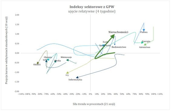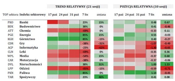 Ostatnie sesje przyniosły kilka ciekawych zmian na sektorowej mapie GPW. Ubiegłotygodniowi liderzy – górnictwo i paliwa – zachowali się dość słabo, co przełożyło się na spadki zarówno siły trendu, jak i odchylenia od 10–okresowej średniej.