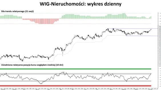 Największe straty poniósł jednak WIG–Informatyka, notując spadek siły trendu o 62 pkt proc. oraz odchylenia od średniej o 0.65 σ. Tym samym, przy odchyleniu −1.3 σ, indeks ten ląduje na ostatnim miejscu w tabeli pozycji relatywnych. Tuż nad nim znajduje się WIG–Gry, którego kurs wyznaczył nowe kilkumiesięczne minima i obecnie testuje ważne wsparcie techniczne. Nie doszło też do kontynuacji odbicia na WIG–Odzież. W tydzień indeks stracił 0.71 σ i 15 pkt proc. siły trendu, schodząc do −85 proc. To obecnie najniższa wartość relatywnej siły trendu.