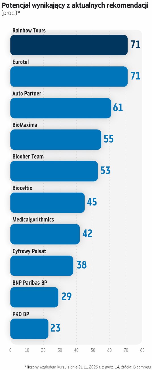 Wyceny spółek z warszawskiego parkietu w 2025 roku w wielu przypadkach znacząco urosły, ale większość nie jest oderwana od fundamentów. – Wysoki odsetek pozytywnych rekomendacji nie powinien dziwić. O nadmiernym optymizmie analityków można byłoby mówić w przypadku, gdyby przekroczył historyczną średnią z poprzednich lat na poziomie 70 proc. Widziałbym jednak obecnie powody fundamentalne, dla których mamy przewagę rekomendacji pozytywnych – wyjaśnia Michał Krajczewski, kierownik Zespołu Doradztwa Inwestycyjnego w Biurze Maklerskim BNP Paribas. – Koniunktura gospodarcza w naszym kraju jest solidna, a oczekiwania ekonomistów wskazują na jej poprawę w 2026 r. Mamy stabilną sytuację w sektorze konsumenckim i poprawiającą się w obszarze inwestycji i przemysłu, co wspiera duże grono spółek notowanych na GPW. Wprawdzie wyceny są w granicach historycznych średnich, to jednak w relacji do oczekiwanego wzrostu wyników notowanych przedsiębiorstw cały czas można je określić jako atrakcyjne – ocenia ekspert.