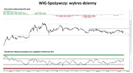 W tej chwili nie widać wyraźnych liderów w prawej górnej ćwiartce wykresu, ponieważ żaden indeks nie przekracza +1 σ w pozycji relatywnej. Z kolei na dole skali najsłabsze pozostają WIG-Informatyka i WIG-Leki, które są nieco bardziej odchylone w dół, choć nadal w granicach -1 σ. Jeśli chodzi o siłę trendu, warto zwrócić uwagę, że WIG-Motoryzacja zyskuje na sile, nadrabiając straty, podczas gdy WIG-Gry traci dalej i jego względna siła trendu wynosi już -85 proc.