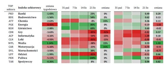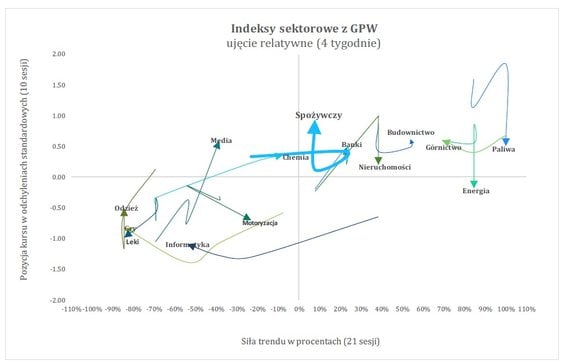W ubiegłym tygodniu na GPW dominowały spadki, a jedynym sektorem, który odnotował dodatni zwrot, był WIG-Media, z wynikiem +1,14 proc. Po drugiej stronie znalazły się m.in. energetyka (-8,45 proc.), motoryzacja (-5,16 proc.) oraz WIG-Paliwa, który stracił 5,11 proc. Widać więc wyraźne zmiany w pozycjach sektorowych. Na przykład ubiegłotygodniowy lider, WIG-Paliwa, spadł o 1,34 σ w sile względnej pozycji. Z kolei energetyka, która straciła najwięcej, zeszła na wartości ujemne, przesuwając się o -1 σ. Warto też zauważyć, że WIG-Media zyskał nie tylko nominalnie, ale również w ujęciu względnym przesunął się o 1,33 σ w górę, co czyni go wyróżniającym się indeksem w krótkim terminie.