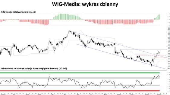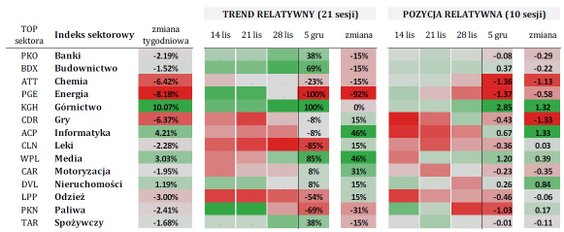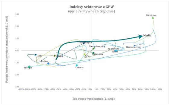 Na drugim biegunie bez większych zmian. Paliwa straciły kolejne 2,41 proc., co przełożyło się na dalsze osłabienie siły trendu relatywnego do −69 proc. (−31 p.p.) i utrzymanie ujemnej pozycji relatywnej (−1,03 odchylenia standardowego). Największe straty zanotowała jednak energia (−8,18 proc.). Siła trendu relatywnego spadła do −100 proc. (−92 p.p.), a pozycja relatywna do −1,37 odchylenia standardowego. Tym samym w kilka tygodni WIG–Energia z jednego z liderów stał się najsłabszym indeksem sektorowym. Słabo wypadły też chemia (−6,42 proc.) i gry (−6,37 proc.), co sugeruje zakończenie okresu poprawy siły relatywnej i zapowiada dalszą słabość tego indeksu względem reszty rynku.