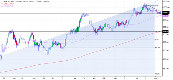 Byki mogą mieć jednak problem, jeśli teraz nastąpiłoby przełamanie wsparcia na poziomie 1000 zł. Oznaczałoby to zejście poniżej wcześniejszego potwierdzonego szczytu, wyrysowanego w połowie sierpnia, czyli złamanie trendu wzrostowego w średnim terminie. Wówczas prawdopodobnym celem podaży stałyby się okolice 870 zł, miejsce dołków z września i szczytów z marca, kwietnia i maja.
