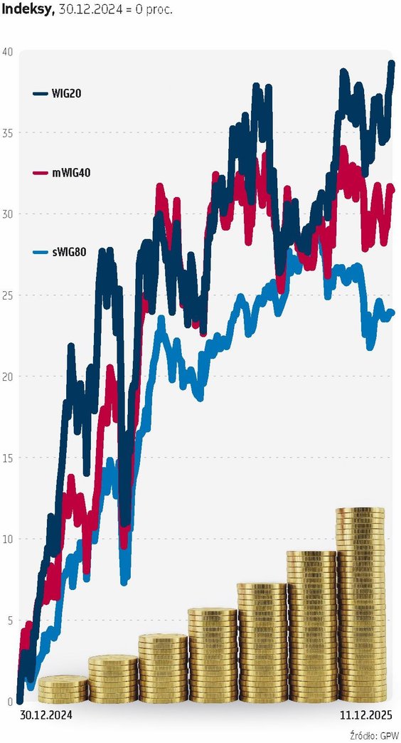Analitycy i zarządzający bardzo przychylnie spoglądają na ten segment rynku, wskazując, że stanowi on atrakcyjną opcję dla stosunkowo już wysoko wycenianych dużych firm, gdzie perspektywy wzrostu zysków są ograniczone, a dodatkowo są one dużo bardziej narażone na globalne zawirowania na rynkach oraz ryzyko polityczne. – Uważam, że po relatywnie słabszym zachowaniu małych i średnich spółek w 2025 r. w przyszłych miesiącach osiągną one wyraźnie lepsze wyniki inwestycyjne niż spółki z WIG20. Przede wszystkim w ubiegłym roku WIG20 rósł głównie dzięki Orlenowi, bankom oraz KGHM, w moim odczuciu fundamentalnie trudno będzie liczyć na wzrosty w tych segmentach w 2026 r. (słabsze wyniki banków, również słabe otoczenie makro na rynku paliw, spektakularny wzrost KGHM również ma swoje ograniczenia, spółka notuje się przy wymagających mnożnikach). Nawet przy sprzyjającym zachowaniu krajowej gospodarki (solidny wzrost PKB i niska inflacja) brak jest przełożenia na istotną poprawę wyników tych spółek – wskazuje Tomasz Bursa, doradca inwestycyjny i wiceprezes Opti TFI. Równocześnie zwraca uwagę, że duże spółki mogą być silniej eksponowane na potencjalne pogorszenie nastawienia inwestycyjnego w stosunku do rynków wschodzących. – Z drugiej strony spółki wchodzące w skład mWIG40 i sWIG80 są wyraźnie mniej podatne na ruchy kapitału zagranicznego i w większym stopniu korzystają z poprawy otoczenia makro szczególnie w obszarze lepszej sytuacji konsumenta i spodziewanego ożywienia inwestycyjnego związanego z wykorzystaniem środków KPO. Równocześnie mają bardziej stabilny akcjonariat z dużym udziałem strategicznych inwestorów założycieli oraz OFE i PPK – zauważa.