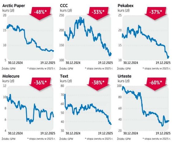 W 2025 r. koniunktura na krajowym parkiecie sprzyjała zyskom. Zdecydowana większość spółek z warszawskiej może się pochwalić mniej lub bardziej imponującymi dodatnimi stopami zwrotu. Są jednak i takie firmy, które zdecydowanie zawiodły. Czym sobie na to zasłużyły?