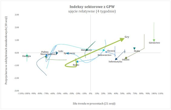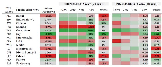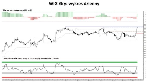 W tabeli trendu relatywnego WIG-Gry przesunął się o imponujące 92 punkty procentowe w górę, osiągając +54 proc.. Na szczycie nadal pozostaje jednak górnictwo z pełnymi +100 proc., podczas gdy energia utrzymuje się na -100 proc.. Warto także odnotować, że banki i odzież straciły po 31 punktów procentowych siły trendu, podczas gdy chemia zyskała 31 punktów procentowych.