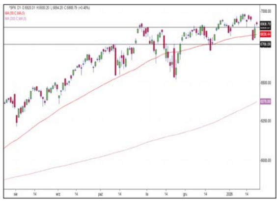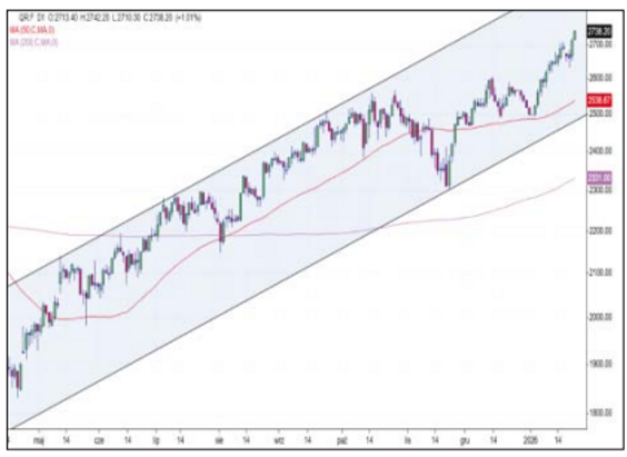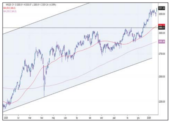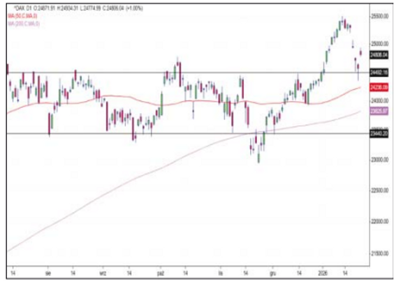 Warszawska giełda jest mocna od początku roku i na ten moment to rynki bazowe mają więcej do nadrobienia. Główne indeksy zarówno w USA czy w Niemczech w pierwszej połowie tego tygodnia zeszły poniżej poziomów zamknięcia 2025 r., choć wiele wskazuje na to, że tylko chwilowo. W czwartkowe popołudnie DAX zyskiwał o 1 proc. i był już powyżej zamknięcia 2025 r., zaś S&P 500 przed otwarciem handlu kasowego notował 0,44-proc. umocnienie. Jeśli chodzi o DAX-a, to w środę doszło do głębokiego testu wsparcia w postaci górnego ograniczenia kilkumiesięcznego ruchu bocznego, jaki obserwowaliśmy w II połowie zeszłego roku. Wsparcie to udało się utrzymać, a to mocny sygnał dla byków. Kolejnym będzie wybicie lokalnego i jednocześnie historycznego szczytu, jaki DAX osiągnął w połowie stycznia.