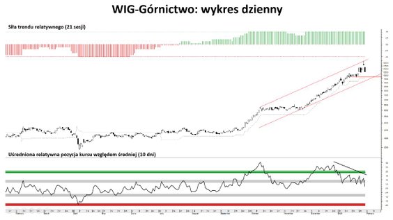 Największy udział we wzrostach w ubiegłym tygodniu miały w dużej mierze te same sektory co tydzień wcześniej. Banki zyskały niemal 4 proc., energia wzrosła o prawie 8 proc., a paliwa umocniły się o blisko 5 proc. Na uwagę zasługuje również motoryzacja, która zanotowała wzrost sięgający niemal 6 proc. Po drugiej stronie rynku ponownie znalazły się gry, które po nieudanej próbie kontynuacji wzrostów straciły ponad 3 proc. Słabiej zachowywały się także odzież (–1,98 proc.) oraz media (–1,05 proc.). Najwięcej emocji przyniósł jednak wykres WIG-górnictwo, do którego wracamy w dalszej części komentarza.