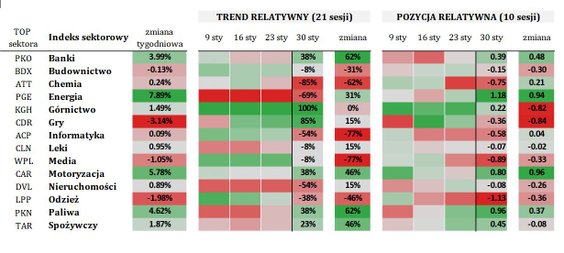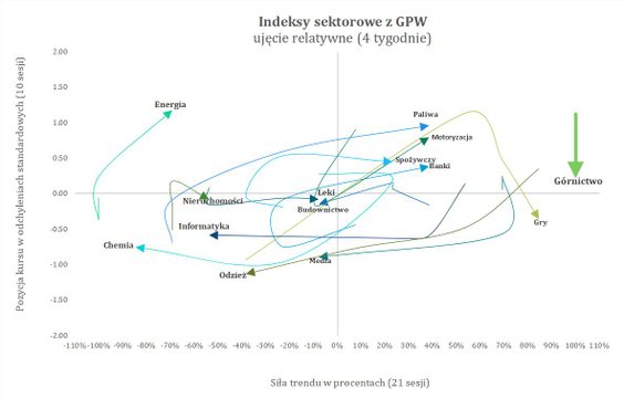Po przeciwnej stronie skali warto odnotować wyraźną poprawę w energetyce. Sektor zyskał 32 p.p. siły trendu oraz ponad 1 σ w pozycji relatywnej, co wyraźnie wyróżnia go na tle wcześniejszych tygodni. Nadal słabo prezentują się natomiast chemia, odzież oraz informatyka, które pozostają w ogonie zestawienia.