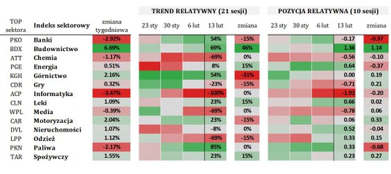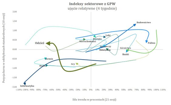Zupełnie inaczej prezentuje się sytuacja ubiegłotygodniowych liderów. Banki straciły 2,92 proc., a paliwa 2,17 proc.. Na obu sektorach widzimy też silne spadki pozycji relatywnej: banki –0,97 σ, a paliwa –0,68 σ. Nie jest to jednak jeszcze zapowiedź trwałej słabości, ponieważ oba sektory utrzymują dodatnią siłę trendu i są nadal widoczne po prawej stronie mapy sektorowej.