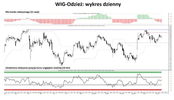Bezsprzecznie najsłabszym sektorem pozostaje informatyka. Spadek o 3,47 proc. przekłada się na utrzymanie siły trendu na skrajnym poziomie –100 proc. i dalsze pogorszenie pozycji relatywnej (do –1,91 σ). Co istotne, brak poprawy w obu wskaźnikach sugeruje, że sektor nie wysyła na razie sygnałów budowania trwałego dna.