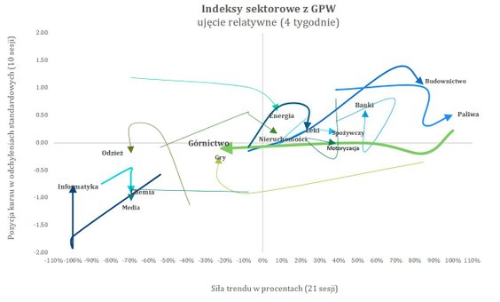 Ostatnie sesje przyniosły kontynuację rotacji sektorowej, o której pisaliśmy przed tygodniem. Nadal dobrze prezentuje się budownictwo, które mimo minimalnego spadku tygodniowego (–0,43 proc.) pozostaje jednym z dwóch najmocniejszych sektorów w ujęciu relatywnym. Siła trendu wzrosła o 15 p.p. do 85 proc., a pozycja relatywna utrzymuje się wysoko, na poziomie +1,05 σ. To sygnał, że kapitał nadal preferuje ten obszar rynku, nawet jeśli krótkoterminowa dynamika cen chwilowo wyhamowała. Równie solidnie prezentują się paliwa (+1,40 proc.), które poprawiły siłę trendu o kolejne 15 p.p., dobijając do maksymalnej wartości +100 proc.. Wysoka pozycja relatywna (+0,51 σ) potwierdza, że sektor wciąż znajduje się w ścisłej czołówce.