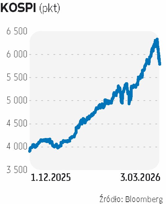 Ostry spadek koreańskiego indeksu KOSPI był w dużym stopniu spowodowany przeceną papierów koncernów Samsung Electronics i SK Hynix, które spadły odpowiednio o niemal 10 proc. i 12 proc. Ich przecena była jednak spowodowana nie tyle przez wojnę na Bliskim Wschodzie, co przez doniesienia, że masowa produkcja Samsunga w fabryce w Teksasie została przesunięta z tego roku na 2027 rok. Akcje niektórych koreańskich spółek zbrojeniowych rosły natomiast bardzo mocno. Papiery firmy Hanwha Aerospace zdrożały o 20 proc., a akcje producenta systemów przeciwlotniczych LIG Nex1 rosły o 30 proc. Akcje spółki Hyundai Rotem, producenta czołgów K2, poszły w górę o 8 proc.