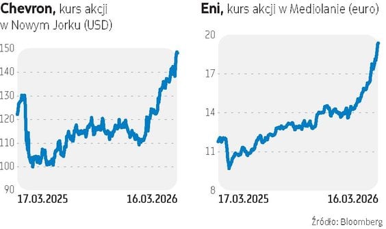 Wartość rynkowa koncernu ExxonMobil wzrosła do 630 mld USD, a Chevronu do niemal 390 mld USD. Akcje pierwszej z tych spółek zyskały w ciągu pierwszych dwóch tygodni wojny 5 proc., a drugiej 7 proc. Wycena Shella doszła do rekordowych 190 mld funtów, a kurs jego akcji zyskał w dwa tygodnie 12 proc. Solidnie rosły również papiery innych europejskich koncernów. Akcje brytyjskiego BP wzrosły o ponad 12 proc. od końca lutego, osiągając wycenę rynkową 82 mld funtów, natomiast francuski Total zyskał około 10 proc., sięgając 176 mld euro kapitalizacji. Włoski koncern ENI wzrósł w tym czasie o 13 proc. i stał się wart 67 mld euro.