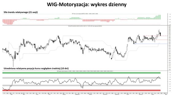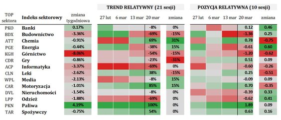 Ostatni tydzień potwierdził słabość szerokiego rynku. Większość sektorów zakończyła go pod kreską, a niektóre z nich zeszły na nowe wielomiesięczne minima. Na tym tle wciąż wyróżniają się paliwa, które wzrosły o 4,19 proc. i utrzymały maksymalną siłę trendu na poziomie +100 proc.. Pozycja relatywna sięgała w trakcie tygodnia okolic +2 σ (aktualnie +1,89 σ), co wskazuje na silne wykupienie. Mimo tego trend pozostaje stabilny, ponieważ na razie nie widać sygnałów słabości. Ubiegłotygodniowa gwiazda, czyli chemia, kontynuuje poprawę siły trendu (+31 p.p., do +69 proc.), ale oddała część przewagi relatywnej. Pozycja spadła do +0,78 σ (-0,75 σ w tydzień), co sugeruje schłodzenie po bardzo dynamicznym odbiciu.