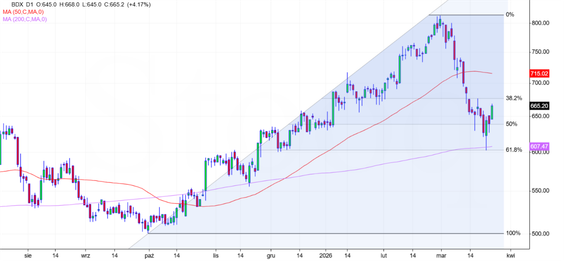 Przed środową sesją marcowy spadek walorów Budimeksu sięgał ponad 20 proc., co jest umowną granicą bessy. W połowie tygodnia akcje budowlanej grupy złapały wiatr w żagle, wykorzystując ogólną poprawę nastrojów. Sytuacja Budimeksu w ostatnich dniach stała się dość poważna, natomiast popyt zareagował w nieprzypadkowym miejscu. W poniedziałek kurs dotarł do ważnego wsparcia w ujęciu kilkumiesięcznym. Mowa o 61,8-proc. zniesieniu fali wzrostowej, zapoczątkowanej jesienią ubiegłego roku. Jednocześnie w tych samych okolicach przebiega średnia cen z dwustu sesji. Co równie istotne, w ostatnich dniach można dostrzec wzrost obrotów. W efekcie kurs Budimeksu dość sprawnie powrócił powyżej 50-proc. zniesienia wspomnianej fali. Popyt zebrał się zatem w samą porę, a wspomniane sygnały są solidnym punktem wyjścia do odreagowania gwałtownej przeceny z pierwszej połowy miesiąca.
