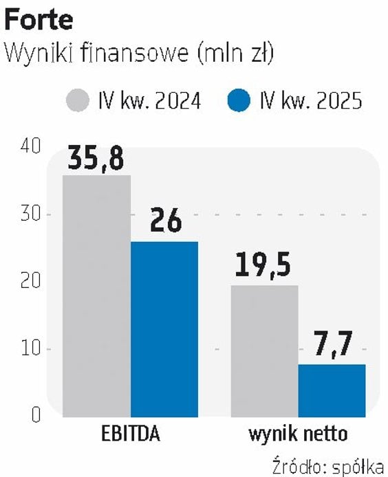 Końcówki 2025 r. do udanych nie zaliczy Forte. Po kilku udanych kwartałach, kiedy mimo wciąż trudnej sytuacji w branży meblarskiej grupie udało się poprawić rentowność oraz obniżyć zadłużenie, przyszło rozczarowanie. Wyniki spółki tym razem wypadły poniżej oczekiwań rynku. Istotny wpływ na nie miały zdarzenia o charakterze jednorazowym. Pozytywny wpływ zabezpieczeń walutowych na wyniki wyniósł 15,2 mln zł, w porównaniu do 22,5 mln zł w analogicznym kwartale roku poprzedniego. – Raportowane wstępne dane za III kwartał 2025/26 (okres od października do grudnia – red.) oceniamy negatywnie. Plasują się poniżej naszej prognozy. Po pierwszym kwartale wysokiego sezonu należy oczekiwać więcej – uważa Dariusz Dadej, analityk Noble Securities. Wskazuje, że największym wyzwaniem dla spółki wciąż pozostaje sprzedaż. Jednocześnie zauważa, że kończy się pozytywny wpływ zabezpieczeń walutowych na wyniki. – Rok obrotowy 2026/27 zapowiada się jako mocno wymagający dla grupy, co zgodnie z przekazem zarządu, oznacza brak powtarzalności obecnych wyników w otoczeniu słabego popytu i utrzymującej się presji kosztowej. Dodatkowym obciążeniem będzie wygaszenie pozytywnego wpływu strategii zabezpieczających, istotnie zwiększające wrażliwość rentowności na kurs walutowy i presję na wyniki operacyjne. Choć pełna konsolidacja zakupionej firmy Specyfic pozytywnie wpłynie na skalę działalności i wynik netto, nie zneutralizuje negatywnego efektu braku wsparcia z hedgingu – uważa ekspert.