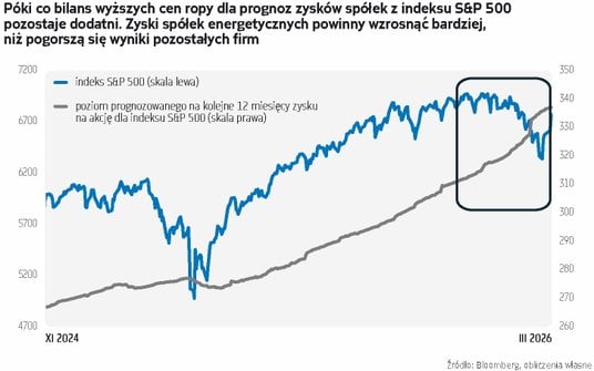 Rynki akcji mogły i nadal mogą pozwolić sobie na utrzymywanie nadziei na trwałą deeskalację, ponieważ ryzyko silnego spowolnienia gospodarczego, spadku przychodów i zysków spółek oraz wzrostu bezrobocia wciąż wydaje się odległe. Doszło nawet do tego, że rynkowe prognozy zysków dla spółek z indeksu S&P 500 na lata 2026-2027 wzrosły w ostatnich tygodniach, między innymi za sprawą wyraźnej poprawy perspektyw sektora energetycznego, czego jeszcze niedawno nikt nie zakładał (wykres 1). Lekkie obniżenie prognoz dla spółek przemysłowych nie było w stanie tego zrównoważyć. Na rynku długu negatywna reakcja na działania wojenne była relatywnie silniejsza niż na rynku akcji. Wzrost inflacji wydaje się bowiem nieuchronny, a pytanie dotyczy raczej tego, jak długo się utrzyma i czy zmusi banki centralne do podwyżek stóp procentowych, czy jedynie zakończy dotychczasowy cykl obniżek. Jedną z najbardziej widocznych różnic w zachowaniu akcji i obligacji można było obserwować na polskim rynku. GPW okazała się bardzo odporna na kryzys w Zatoce Perskiej, a indeks WIG podczas pierwszej sesji po świętach zaatakował nawet lutowy rekord, jeszcze zanim Trump odroczył „koniec cywilizacji”.