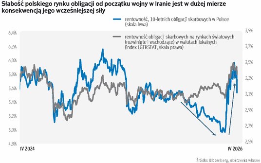 Z kolei silne spadki obligacji skarbowych wyraźnie zaniepokoiły inwestorów, którzy tak gwałtownej, kilkuprocentowej przeceny nie widzieli od czterech lat. Rentowność polskich 10–letnich obligacji wzrosła z 4,9 proc. do niemal 6 proc., czyli do poziomu notowanego rok wcześniej. W ciągu pięciu tygodni działań wojennych na Bliskim Wschodzie polskie obligacje należały do najsłabszych na świecie, podczas gdy krajowe akcje pozostawały jednymi z najmocniejszych. Czy z tej rozbieżności należy wyciągać negatywne wnioski dla przyszłości krajowego rynku długu?