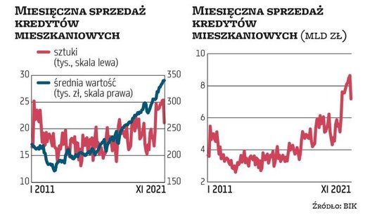 Mniejszy popyt na hipoteki widać już od paru miesięcy po malejącej liczbie wniosków o kredyty tego typu. W listopadzie było tylko 36 tys. wniosków. To wprawdzie o 14 proc. więcej niż rok temu (gdy popyt na hipoteki wciąż się odbudowywał po pandemii i banki dopiero zaczynały luzować zaostrzoną wcześniej politykę kredytową, przeszkadzała też druga fala pandemii), ale o 7 proc. mniej niż w październiku. Jeszcze latem było po 42 tys. wniosków miesięcznie, w maju i czerwcu po 48 tys., w rekordowych zaś ostatnio marcu i kwietniu odpowiednio 56 tys. i 51 tys. – W przypadku stabilizacji lub spadku cen na rynku nieruchomości oraz dalszego spadku liczby wnioskodawców przestanie rosnąć średnia wartość wnioskowanego kredytu. W konsekwencji spadnie popyt nie tylko w ujęciu liczbowym, ale i wartościowym. To z kolei wyhamuje, a nawet zmniejszy akcję kredytową w ujęciu wartościowym – mówi prof. Waldemar Rogowski, główny analityk BIK. Z uwagi na specyfikę udzielania kredytów mieszkaniowych, gdzie od złożenia wniosku do decyzji kredytowej mija około dwóch miesięcy, listopadowe wnioski klientów o finansowanie przełożą się na sprzedaż dopiero w grudniu i styczniu. Ekspert BIK dodaje, że innym ważnym czynnikiem, który może osłabić zainteresowanie Polaków kredytami, są kolejne podwyżki stóp procentowych. – Oznaczają one wprost niższą zdolność kredytową dla osób ubiegających się o finansowanie w bankach – mówi Rogowski.