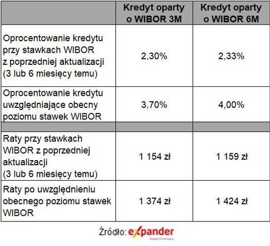 Poziom oprocentowania kredytów opartych na stawce WIBOR 6M zwykle jest aktualizowany co sześć miesięcy od momentu uruchomienia kredytu. Oznacza to, że dla tych, które będą miały aktualizację w najbliższym czasie, dotychczas obowiązywał poziom WIBOR-u z maja. Wtedy stawka WIBOR 6M wynosiła zaledwie 0,24 proc., co było najniższym poziomem w historii. Po uwzględnieniu obecnego poziomu 1,91 proc. oprocentowanie znacznie wzrośnie. Dla kredytów udzielonych od marca 2015 r. ten nowy poziom oprocentowania będzie najwyższy w całym okresie spłaty. W rezultacie rata w takich przypadkach wzrośnie z najniższego od razu do najwyższego poziomu. W przypadku kredytu na 300 tys. zł na 30 lat z marżą 2,09 proc. (udzielonego przed rokiem) rata podskoczy z 1 159 zł (płaconych przez ostatnie 6 miesięcy) do 1 424 zł (obowiązujących przez kolejne 6 miesięcy) – wynika z wyliczeń Expandera. Wzrost wyniesie więc 265 zł, czyli aż 23 proc.