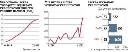 Spośród 410 wyroków z października (łącznie prawomocnych i nieprawomocnych) około 95 proc. było korzystnych dla frankowiczów. Wskaźnik wygranych jest więc podobny jak w poprzednich miesiącach. Pozostałe 5 proc. wyroków było korzystnych dla banków. W zakresie korzystnych dla klientów orzeczeń dominuje stwierdzenie nieważności umów kredytowych (było 95 proc. takich wyroków). Odfrankowienie (przewalutowanie na złote po kursie z dnia zaciągnięcia i utrzymanie stawki LIBOR) zdarza się tylko w pojedynczych rozstrzygnięciach.
