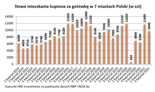 - W ostatnim czasie mieszkania zdrożały i to wyraźnie. W efekcie owszem prawdą jest, że I półrocze było rekordowe pod względem kwoty gotówki wydanej na zakup nowych mieszkań przez Polaków, ale za to liczba kupionych w ten sposób lokali nie jest już rekordowa. Przez sześć miesięcy na siedmiu badanych rynkach w ręce nabywców gotówkowych trafiło około 21,4 tys. mieszkań. To o ponad 2 tys. mniej niż dotychczasowy półroczny rekord – dodaje.