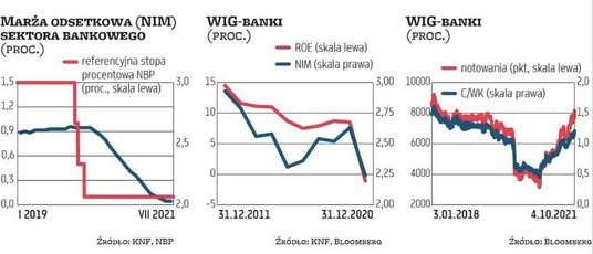 Licząc od stycznia, WIG-banki przebił Euro Stoxx Banks (zrzesza kredytodawców ze strefy euro) aż o 38 pkt proc. Różnica na korzyść polskich banków zaczęła powstawać od maja, gdy dane zaczęły wskazywać na przyśpieszenie wzrostu inflacji i przekraczanie celu NBP w tym zakresie (2,5 pkt proc. +/- 1 pkt proc.). W piątek okazało się, że wrześniowy odczyt znów zaskoczył i inflacja sięgnęła 5,8 proc. Zdaniem ekonomistów w kolejnych miesiącach może dobić do 7 proc. i choć faktycznie ma w dużej mierze charakter podażowy, zwiększa to presję na RPP do podwyżek stóp. Te w Polsce od wiosny 2020 r. utrzymują się na rekordowo niskim poziomie 0,1 proc. Przed pandemią było to 1,5 proc. Podwyżka poprawiłaby zyski i rentowność banków. To główny powód rajdu banków w tym roku. Indeks zyskał 17 proc. od pierwszych dni lutego 2020 r., czyli sesji poprzedzających rynkowy krach spowodowany pandemią. Także wskaźnik C/WK poszybował – teraz wynosi 1,21, najwyżej od lipca 2019 r. To sugeruje, że wzrosty kursów akcji banków to nie tylko efekt odbicia po spadkach w 2020 r., ale inwestorzy zakładają poprawę wyników i powrót do dawnej rentowności.