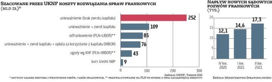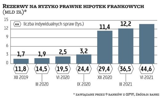 To spowodowało, że po latach spłat przez klientów mocno podwyższonych rat kredytów frankowych, także banki zaczęły odczuwać brzemię tych niefortunnych hipotek. O ile wcześniej negatywny wpływ był głównie reputacyjny i finansowy (ale w tym drugim zakresie tylko w postaci obniżonej rentowności spowodowanej zwiększonymi wymogami kapitałowymi na te kredyty), to od wyroku TSUE frankowy problem zaczął odciskać piętno także w rachunku wyników i bilansie. Stało się tak, bo banki musiały zacząć zawiązywać rezerwy na ryzyko prawne (więcej o tym w ramce poniżej) z powodu rosnącej liczby pozwów sądowych i coraz częstszych wygranych notowanych przez frankowiczów.