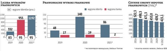 W ostatnich trzech miesiącach 2019 r. zapadło mniej więcej tyle samo wyroków (w coraz większym odsetku korzystnych dla kredytobiorców), co w pierwszych dziewięciu miesiącach tego roku. I choć z perspektywy czasu znaczenie merytoryczne orzeczenia TSUE w sprawie państwa Dziubak bywa zdaniem niektórych prawników przeceniane, to sądy powszechne zinterpretowały ten wyrok w przytłaczającej większości korzystnie dla klientów. To przełożyło się na rosnącą liczbę pozwów w kolejnych miesiącach i latach, co z kolei przyniosło duży wzrost liczby wyroków sądów. O ile w 2019 r. było ich ponad 320 (do tylu udało nam się dotrzeć, prawdopodobnie całkowita liczba może być o kilkanaście procent większa), to w 2020 r. doliczyliśmy się ich już 955, a po niepełnych dziewięciu miesiącach 2021 r. już prawie 1200. Wskaźnik wygranych klientów (dotyczy w przytłaczającej wielkości wyroków nieprawomocnych) wynosił 80 proc. w 2019 r. i po około 93 proc. w latach 2020 i 2021.