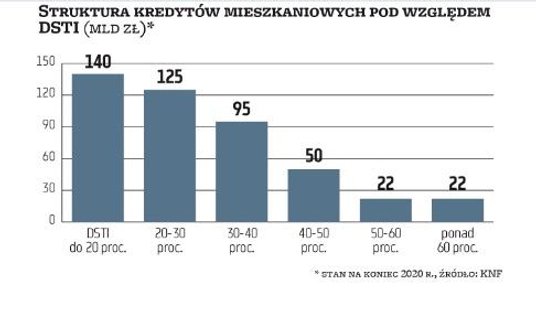 Z danych KNF wynika, że na koniec 2020 r. średni DSTI w polskim sektorze bankom wynosił w przypadku hipotek 29 proc., czyli nieco niżej niż rok wcześniej, gdy było to 30 proc. Średnie poziomy DSTI klientów mających kredyty złotowe były zbliżone do wartości DSTI dla klientów posiadających kredyt walutowy. W przypadku tych drugich raty nie urosły tak mocno, jak wynikałoby to z samego zwiększenia wartości kredytu po osłabienia złotego, bo spadły stopy procentowe. Kredyty mające DSTI do 20 proc., czyli najbezpieczniejsze, były warte 140 mld zł na koniec 2020 r. Te w przedziale 20–30 proc. sięgnęły 125 mld zł, a ze wskaźnikiem między 30 a 40 proc. były warte 95 mld zł. Kredyty w przedziałach już nieco bardziej ryzykownych, czyli 40–50 proc. i 50–60 proc., były warte odpowiednio ponad 50 mld zł i 22 mld zł. To o tyle istotne, że w przypadku większości gospodarstw domowych koszty utrzymania przekraczają połowę ich dochodów netto. Te najbardziej ryzykowne hipoteki o DSTI ponad 60 proc. były warte około 22 mld zł.