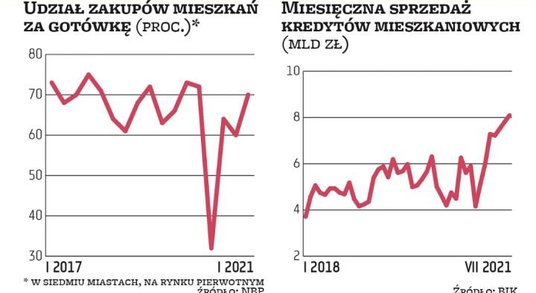 Rogowski zwraca uwagę, że udział kredytów w sprzedaży mieszkań nie jest wielki: w I kwartale transakcje gotówkowe (pomijając wkład własny) stanowiły aż 70 proc. transakcji mieszkaniowych – wynika z danych NBP (chodzi o rynek pierwotny i siedem czołowych miast w Polsce). W poprzednich kilkunastu kwartałach wskaźnik ten mieścił się w przedziale 60–75 proc. (pomijając dotknięty pandemią II kwartał 2020 r.). Gotówka wydana na mieszkania w I kwartale (bez wkładu własnego, tylko rynek pierwotny w siedmiu miastach) to 5,9 mld zł, najwięcej w historii.