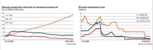 W przypadku hipotek w euro i innych walutach nikt takich statystyk nie podaje, nawet same banki mające tego typu kredyty. Z informacji płynących od kancelarii frankowych wynika, że przypadków kwestionowania w sądach hipotek w walutach innych niż frank szwajcarski jest bardzo niewiele. W dużej mierze wynika to naturalnie z tego, że kredytów tych udzielano znacznie mniej niż frankowych (więcej w ramce poniżej). Te w euro i pozostałych walutach (to prawdopodobnie głównie dolar, za część odpowiada też jen) są teraz warte odpowiednio 21,8 mld zł i 6,6 mld zł w porównaniu z 94 mld zł w przypadku frankowych.