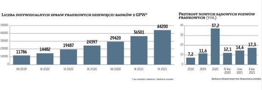 MS podaje, że w całym 2020 r. napływ nowych spraw sięgnął 37,2 tys. wobec 11,6 tys. w 2019 r. i 7,2 tys. w 2018 r. Ostatnie miesiące są rekordowe – w II kwartale wpłynęło aż 17,3 tys. spraw, a I kwartale – 14,6 tys. Związek Banków Polskich podaje, że na koniec czerwca przeciw polskim bankom toczyło się 58 tys. spraw dotyczących hipotek frankowych, czyli o prawie 20 tys. więcej niż na koniec 2020 r. To oznacza, że już blisko 15 proc. czynnych umów frankowych jest przedmiotem sporu sądowego i wskaźnik ten do końca roku może zbliżyć się do 18–20 proc.