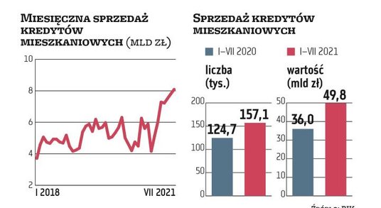 Lipcowa sprzedaż pod względem wartości jest rekordowa w historii, po raz pierwszy miesięczna sprzedaż przekroczyła 8 mld zł. Jest ona efektem składania wniosków przez klientów w maju i czerwcu. Wielki wzrost rok do roku nie jest zaskoczeniem, bo rok temu z powodu pandemii (w wyniku spadku popytu na finansowanie oraz ograniczenia podaży po zaostrzeniu polityki kredytowej przez banki) sprzedaż była wyjątkowo niska. Jednak obecna rekordowa sprzedaż to nie jest tylko efekt niskiej bazy i realizacji odroczonego popytu. W lipcu udzielono bowiem aż o 31 proc. więcej kredytów mieszkaniowych niż w przedpandemicznym lipcu 2019 r. – już wtedy sprzedaż mocno rosła i w całym roku była najwyższa od dekady. Bicie rekordów w zakresie sprzedaży kredytów mieszkaniowych trwa już od paru miesięcy – lipiec był piątym z rzędu ze sprzedażą ponad 7 mld zł. Po siedmiu miesiącach udzielono już 157 tys. hipotek wartych 50 mld zł – to wzrost odpowiednio o 26 proc. i 38 proc. w skali roku.