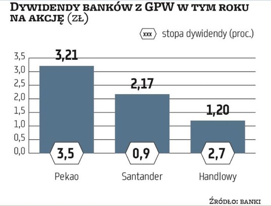 Komisja Nadzoru Finansowego zdecydowała, że niektóre banki, po spełnieniu odpowiednich kryteriów, będą mogły wypłacić pieniądze akcjonariuszom w drugim półroczu, ale tylko z zysku za 2020 r. (niepodzielone zyski z lat ubiegłych pozostają nietknięte). Pekao może wypłacić – ma na to zgodę akcjonariuszy – 75 proc. zysku z 2020 r., czyli przekaże im ponad 840 mln zł. Na akcję oznacza to 3,21 zł i stopę dywidendy w okolicach 3,5 proc. Dzień ustalenia prawa do dywidendy przypada 10 września, jej wypłata nastąpi 29 września. Handlowy może wypłacić 100 proc. zysku, ma zgodę akcjonariuszy i trafi do nich blisko 160 mln zł. Oznacza to 1,2 zł na walor i stopę dywidendy w okolicach 2,7 proc. Dzień dywidendy to 15 września, zostanie wypłacona 22 września. W przypadku Santandera KNF zgodził się, aby maksymalny wskaźnik wypłaty wyniósł 30 proc. z zysku wypracowanego w 2020 r., więc do akcjonariuszy popłynie nieco ponad 220 mln zł, czyli 2,17 zł na akcję, a stopa dywidendy wyniesie 0,9 proc. Niedawno zarząd potwierdził chęć wypłaty tej kwoty. Nie wiadomo, co z ING Bankiem Śląskim, który technicznie może wypłacić nawet cały zysk z 2020 r., ale problem w tym, że został już w kwietniu podzielony (675 mln zł, czyli połowa z 1,34 mld zł zysku z 2020 r., trafiło na kapitał rezerwowy). Gdyby miał wypłacić połowę zarobku, na akcję przypadłoby 5,15 zł, co dałoby 2,8 proc. stopy dywidendy. MR