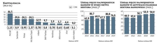 Postępująca od kilkunastu lat konsolidacja polskiego rynku bankowego spowodowała, że udział pięciu czołowych kredytodawców (pod względem wielkości sumy bilansowej) w aktywach całego sektora wynosi obecnie już 56 proc., czyli wyraźnie więcej niż 48,3 proc. zanotowane w 2016 r. i 43,4 proc. w 2012 r. – wynika z danych Komisji Nadzoru Finansowego. Do zwiększenia tego wskaźnika przyczynił się też szybszy niż średni rynku wzrost aktywów większości banków zaliczanych do czołowej piątki.