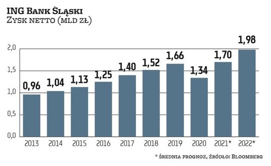 Duży progres od lat notuje ING BSK, który pod względem wysokości zysku wskoczył już na czwarte miejsce w polskim sektorze bankowym. Według prognoz może w tym i przyszłym roku osiągnąć odpowiednio 1,7 mld zł i 2 mld zł zysku netto, więc prawdopodobnie wyprzedzi pod względem zysku Santandera, którego rezultat obciążany jest rezerwami frankowymi. ING BSK także ma kredyty tego typu, ale stanowią one ledwie 0,7 proc. całego portfela kredytów i w 2020 r. zwiększył rezerwy do poziomu około 35 proc. wartości frankowych kredytów (przez co jego zysk netto spadł do 1,34 mld zł), więc w tym roku najpewniej nie obciąży to jego zysków. ING BSK jest wyjątkiem, bo jego zyski rosną niemal nieprzerwanie z roku na rok od prawie dwóch dekad. W latach 2010–2012 notował po około 0,8 mld zł zysku. W ostatnim roku przed pandemią miał 1,66 mld zł zarobku.