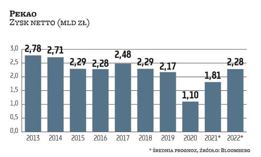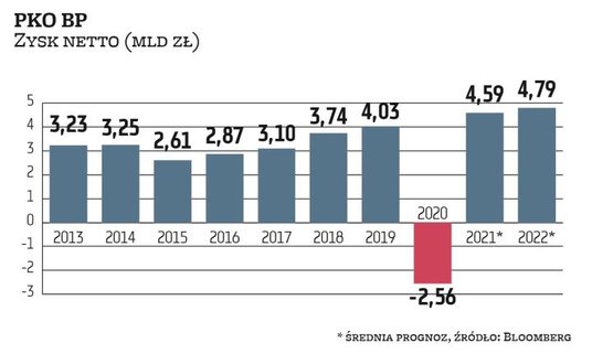 Szczególnie wrażenie robią wyniki PKO BP i ING BSK. Ten pierwszy, jak wskazuje średnia prognoz zebranych przez Bloomberga, zanotuje w tym roku 4,6 mld zł zysku netto i 4,8 mld zł w przyszłym w porównaniu z 2,6 mld zł straty w 2020 r. To była pierwsza strata PKO BP od co najmniej 2001 r. i wynikała ze wspomnianej rezerwy na hipoteki frankowe (gdyby nie ona bank miałby ok. 2,6 mld zł zysku netto w 2020 r.). To jednak w zdecydowanej mierze rozwiązało problem negatywnego wpływu tych kredytów na wyniki i otworzyło drogę do dużych, nieobarczonych rezerwami zysków w tym i przyszłym roku. Oczekiwane przez rynek zyski PKO BP są również wyższe niż w dekadę temu, zanim rozpoczął się cykl obniżek stóp procentowych uderzających w zyski kredytodawców. W latach 2010–2012, gdy stopa referencyjna sięgnęła nawet 4,75 proc., PKO BP osiągał około 3,8 mld zł zysku netto.
