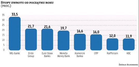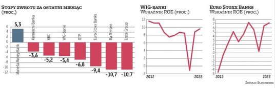 Wciąż gołębia retoryka NBP, wzmocniona niższym odczytem inflacji z czerwca, nie sprzyja polskim bankom. Podwyżka stóp oznaczałaby bowiem wyższy wynik odsetkowy i lepszą rentowność. – Ze średniej prognoz rynkowych na 2022 r. wynika, że łączny wynik odsetkowy sześciu największych banków w Polsce jest o około 20 proc., czyli 8 mld zł, niższy, niż był przed pandemią. Zakładając wolniejsze tempo zacieśniania polityki pieniężnej, banki będą musiały nadal liczyć na wzrost wyniku z opłat i prowizji i dalsze cięcia kosztów działania – dodaje Noetzel. Z kolei wyniki odsetkowe takich banków jak Raiffeisen, Erste czy KBC, które mają spore oddziały w krajach Europy Środkowej, skorzystają już w przyszłym roku (ich wyniki odsetkowe będą napędzane wyższą marżą i niezłą akcją kredytową) na podwyżkach stóp. Dodatkowym wsparciem wyników mogą być rosnące rentowności obligacji posiadanych przez banki.