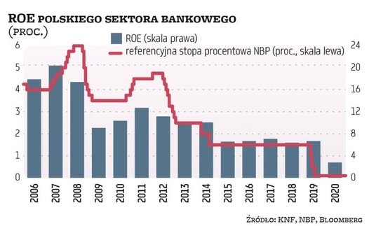 Ten zaś jest zależny od stóp procentowych (choć nie można zapominać o innych istotnych elementach rachunku wyników, takich jak zysk z opłat i prowizji czy koszty działania i ryzyka). Im wyższe stopy, tym wyższą marżę i wynik odsetkowy netto mogą osiągać banki (rezultat ten odpowiada za około 70 proc. przychodów sektora). Przedstawiony obok wykres wyraźnie pokazuje, że wyższe stopy sprzyjają branży – niegdyś jej ROE sięgało średnio nawet 17–20 proc. (lata 2006–2008), ale wtedy stopy procentowe wynosiły 5–6 proc. W 2020 r. sektor miał ROE rzędu 2,8 proc. przy stopie referencyjnej przez ponad połowę roku na poziomie 0,1 proc. Rynek najwyraźniej oczekuje wzrostu rentowności branży, bo wskaźnik C/WK dla indeksu WIG-banki, po głębokim spadku w ub.r. do 0,5, ostatnio wyraźnie odbił i nieco przekroczył 1. To implikuje, że średnia rentowność ROE zgromadzonych w nim banków powinna oscylować wokół 10 proc. Poprawa rentowności może wynikać ze wzrostu zysków za sprawą oczekiwanych podwyżek stóp procentowych. Inflacja przyśpiesza i choć prezes NBP i większość członków RPP nadal zachowują gołębią retorykę, to według ekonomistów pierwsze niewielkie podwyżki pod koniec tego roku nie są wykluczone. Jednak na wzrost ROE wpłynąć może nie tylko wyższy licznik (zysk), ale też niższy mianownik (wysokość zgromadzonych kapitałów). Wprawdzie wymogi w tym zakresie nagle nie zmaleją, ale zielone światło – choć na razie warunkowe – od KNF w zakresie dywidend daje nadzieję na wypłatę akcjonariuszom nadwyżkowych kapitałów. MR