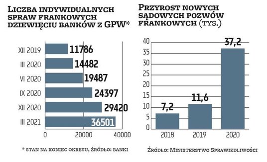 Związek Banków Polskich, opierając się na danych banków odpowiadających za niemal całość frankowego portfela w Polsce, podaje, że od początku roku liczba toczących się postępowań sądowych przeciwko bankom w sprawie tych hipotek urosła o około 12 tys. W samym kwietniu przybyło 3 tys. spraw. Na koniec kwietnia było ich w sądach blisko 51 tys. wobec 37 tys. na koniec 2020 r.