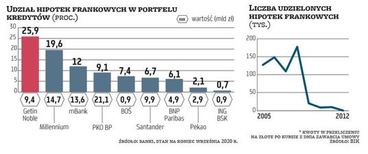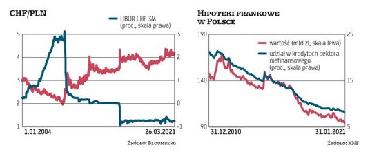 Działanie to objawia się w rosnącej fali pozwów sądowych, na koniec 2020 r. przeciw bankom toczyło się 37,5 tys. indywidualnych spraw, co stanowi 8,8 proc. czynnych kredytów tego typu. Do tego należy dodać pozwy zbiorowe, które angażują łącznie około 6,2 tys. osób. Problem frankowy mogą rozwiązać ugody, a jeśli klienci lub banki nie zdecydują się na nie, rozwiążą go sądy. Najprawdopodobniej w każdym z tych scenariuszy koszt dla sektora może sięgnąć co najmniej kilkadziesiąt miliardów złotych. Ironią historii, że w czasie frankowej hossy bankowcy mieli świadomość ryzyka wynikającego z masowego udzielania tych kredytów osobom zarabiającym w złotych.