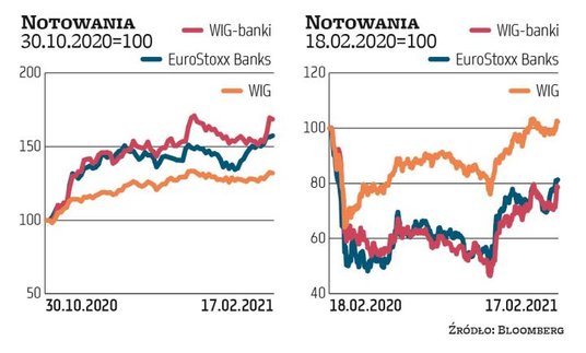 Być może inwestorzy zakładają też pozytywny scenariusz frankowy, czyli sukces programu ugód. – Choć drożały nie tylko tzw. banki frankowe, to zastanawiający jest wzrost notowań właśnie banków obciążonych hipotekami w CHF, szczególnie tuż przed kluczową dla nich uchwałą Sądu Najwyższego planowaną na 25 marca. Zakładam, że będzie ona dla sektora w najlepszym razie neutralna. Ważne będą odpowiedzi na pytania o wynagrodzenie za korzystanie z kapitału i o przedawnienie. Pozostaję negatywnie nastawiony do tego typu kredytodawców. W scenariuszu unieważnienia umów i braku wynagrodzenia dla banków za korzystanie z kapitału koszt dla sektora może sięgać nawet 100 mld zł – mówi Stolarski.