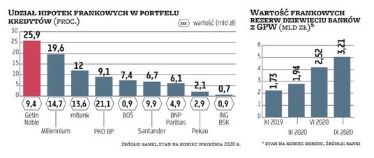 Z naszych nieoficjalnych informacji wynika, że także inne duże banki rozważają obciążenie w dużym stopniu wyników 2020 r. rezerwami na franki. Mimo że prace nad rozwiązaniem trwają i sektor jak mantrę powtarza, że konieczne jest takie skonstruowanie ugody, która w przyszłości, po konwersji na złotego, nie będzie przez klientów kwestionowana prawnie, np. gdyby kurs franka spadł lub stopy procentowe w Polsce i WIBOR wzrosły.